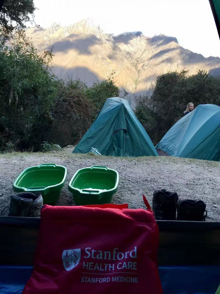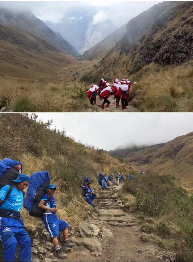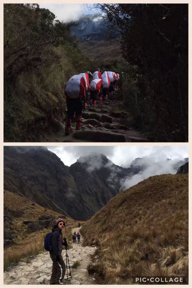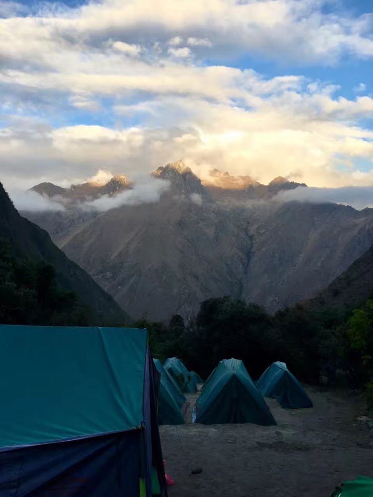 随后又是几乎笔直地沿着巨大的石阶下坡。儿子终于克服了心理障碍,在现实面前学会了使用印加厕所(路边野地)。有一次腹泻太急了,一屁股正坐在一根小竹枝上,被戳得嗷嗷叫。这一路慢慢地走,走了近8小时。到了离营地30分钟的路程,导游派来一名脚夫,背着儿子下山。我担心脚夫如何能背得动近100磅的儿子,会不会一起从山路上的大石阶摔下去。可是一溜烟脚夫背着儿子就不见了,我无法跟上。顾不了落在后面的老公,我提着一颗心到了营地,发现儿子正坐在帐篷里开心极了。好好的用小费谢谢了这位脚夫。