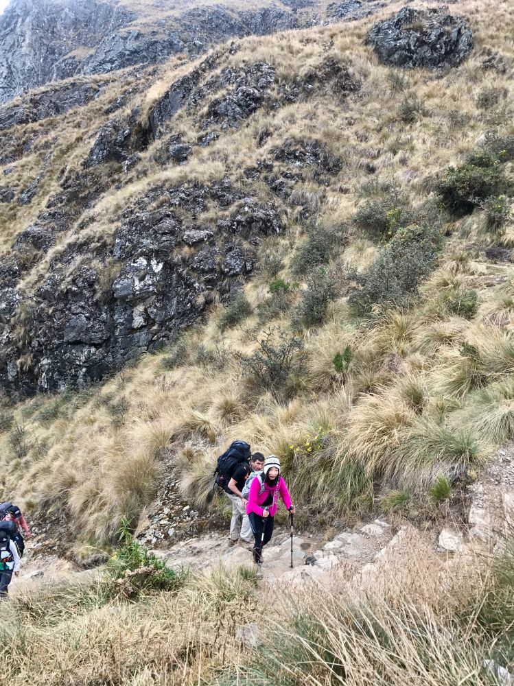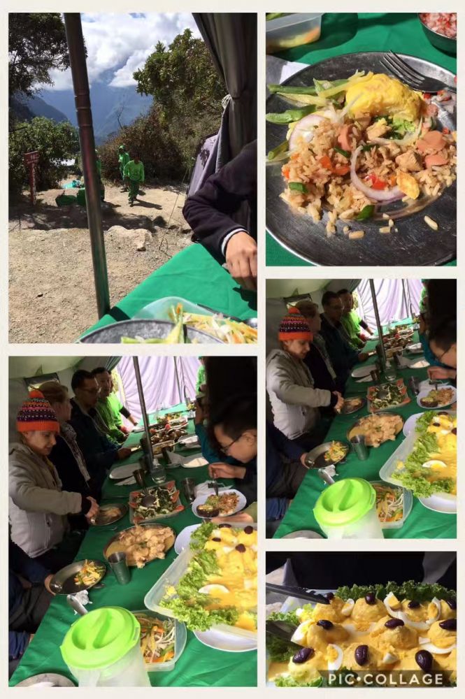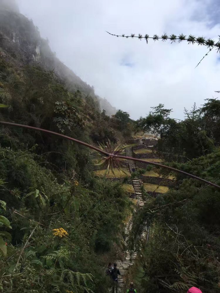 紧接着地是笔直地下降。每往下走一步,我心中就哭泣一下,因为等会要再爬回去的呀!因为今天要过的两个峰口。一路往下620米,到了午餐点。野地里的午餐让人惊讶的丰盛。以秘鲁地道美食为主。我们坐在搭好的帐篷里,吃着新鲜美食,喝着热可可叶茶,觉得翻越死妇人口用完的精力得以恢复,可以继续翻越海拔4000米的第二峰,正常速度预计要4小时才能到达宿营地。虽然已经走了七个小时,心里知道没有退路,我们再累也得埋头前行,必须在天黑前赶到营地。