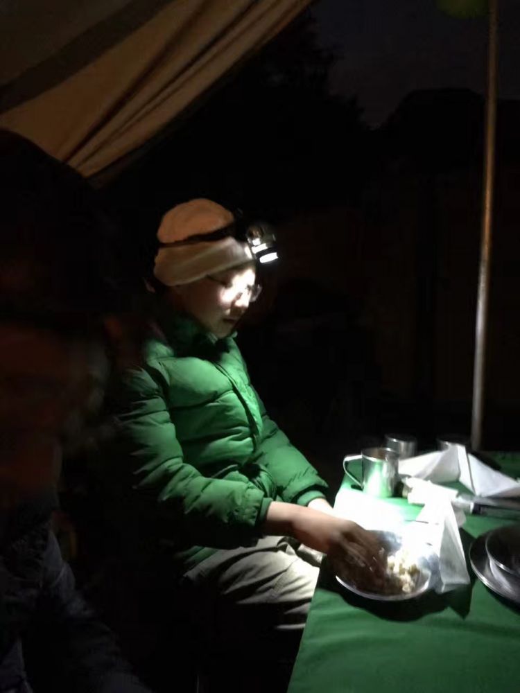 儿子累得躺在帐篷里,随后大吐起来。好在用塑料袋及时接住了。儿子没有任何胃口,勉强喝了些水,不吃晚饭,就睡过去了。晚饭时分,只有一半的团员出现,在场的多数都没有什么胃口。满桌子丰盛的晚餐,我只喝了点汤,浑身说不出来的难受。大家都无话,迅速进入帐篷。夜里儿子大吐了三次,连胆汁都吐出来了。半夜里清理干净儿子和睡袋,虽然很累,也无法入睡。因为一睡着,就会因为缺氧而闷醒。当时不知道这是高山反应,只以为自己是失眠。这是非常辛苦的一天。