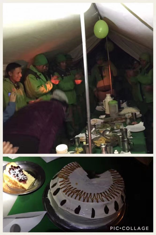 晚上,儿子终于吃了几颗爆米花,喝了点水,没有吐出来了。我们16个人聚在一起,厨师准备好蛋糕,和脚夫们一同提起庆祝。因为明天是最后一天,需要早上三点起床,脚夫需要赶四点半火车回家。在荒山野外能烤出蛋糕真是奇迹,可大家依然没有胃口,还是眷恋着厕所。赶紧早早入睡,恢复体力,明天到达圣地:马丘比丘。