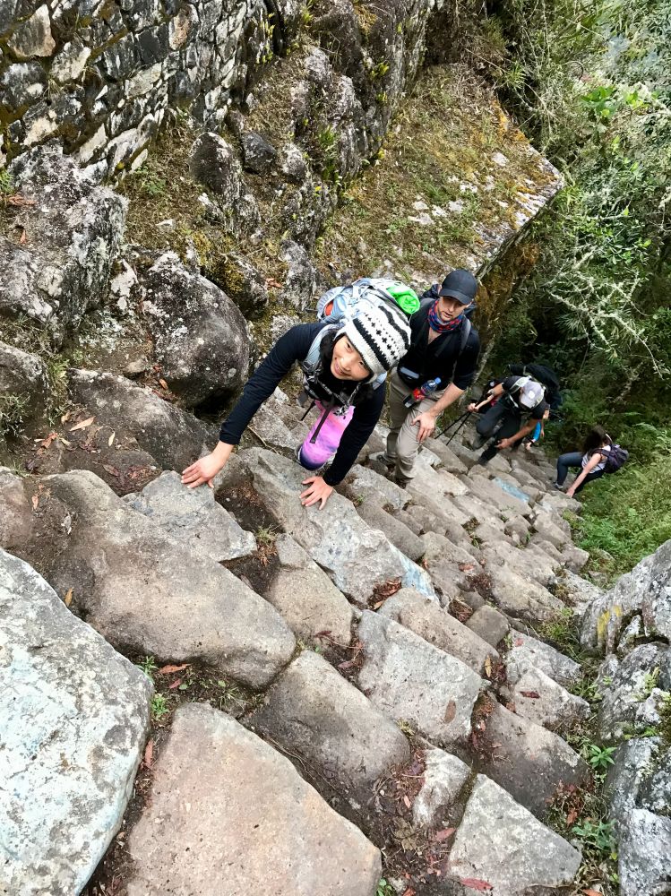 徒步的第四天,也是最后一天,是全程的重头戏:到达马丘比丘。早上三点起床后,在黑夜中200来名徒步客集聚通往马丘比丘的印加古道入口,静静地排队等待其5点半开门。儿子和我因为昨晚营地海拔降到2千多米,睡了一个觉后,高反症状消失得差不多了。儿子的胃口恢复了,等待开门时,吃了厨师事先为我们打包的早餐。在黑暗中戴着头灯走了一个小时来到太阳门,道路不会因为靠近马丘比丘而好走,而是更难走。靠近太阳门时,天已经快全亮了,有一段特别难走, 见图。