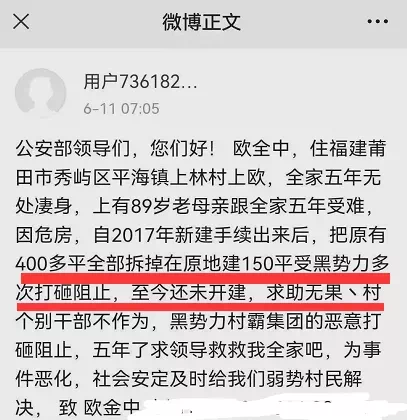 莆田杀人案,震惊了网络。这事的经过想必大家都耳熟能详了:莆田平海镇一个叫欧金中的老实人被村霸欺负了五年,不让他在自己原来的宅基地上翻盖新房,他穷尽了所有的手段寻求帮助,从村委到乡镇到省市到央视、公安部,一级级写信或亲自去拜访,恳求有关部门能做主让自己全家有容身之地。文化水平不高的他甚至学了发微博求助,点赞过很多爱国爱党的大V,他的微博里不是五星红旗就是维权。最后,他维权失败,在红旗飘扬的大地上成了被通缉的“杀人嫌疑犯”。