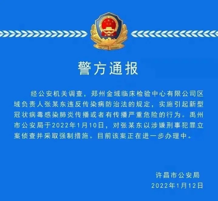 昨天,许昌市警方的一份通报彻底引爆了全网。字数不多,但威力巨大。通报说,郑州金域临床检验中心有限公司区域负责人张某东违反传染病防治法的规定,实施引起新型冠状病毒肺炎传播或者有传播严重危险的行为。目前,已立案侦查。