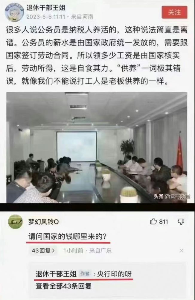 最近看到一个老干部的一段话,展示了新生代“老干部”的精神风貌发生变化,他们不再斤斤计较自己的退休待遇,个别有前沿思想退休干部甚至思索一些更深层次的问题。比如,网上有个“退休干部王姐”就对“纳税人养活官员”提出质疑,认为官员也是劳动者,薪水是国家发的,凭什么说是纳税人养活的?网友反问“请问国家的钱哪里来的?”老干部理直气壮回答——央行印的!
