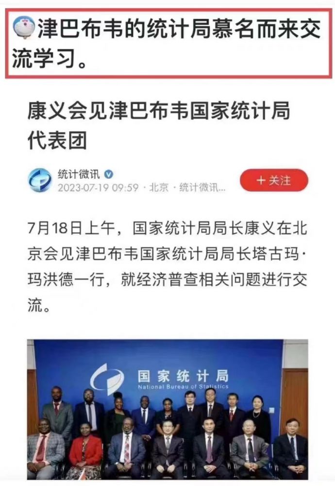 这话在国际上传出去了,津巴布韦国家统计局就慕名来取经了。周所周知,津巴布韦的经济状况一团糟,通货膨胀是天文数字,买袋面包得花亿元面值的钞票。这次津巴布韦好像发现了统计局是国家经济数据好坏的关键,于是不远万里来取经学习了,可能是以为掌握了中国的统计核心技术,就能让津巴布韦经济腾飞了。这事儿还得保密,乌泱乌泱的穷国都来剽窃中国的核心技术,怎么得了。