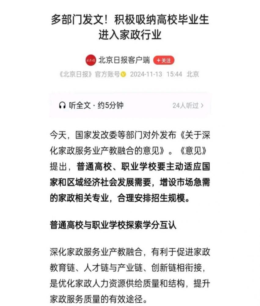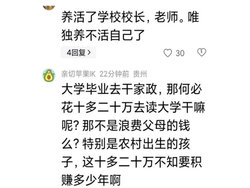 明年的大学生就业现在就让有关部门着急上头,多部门发文,号召高校毕业生积极进入家政业。这差不多是提倡毕业生回家当专职儿女,给别人干家政不如伺候自己的父母,啃老有了新花样:积极进入家政业。花了几十万学费,相当于支付了高额首付,最后自己回收烂尾娃,好温情的回旋镖。大学生从事家政业成了就业的一大出路,耽误了四年大好时光,学校应该给点赔偿才是,至少该退点学费吧。投入产出亏损巨大,以后大学还怎么经营?教育产业离垮塌还有多远?