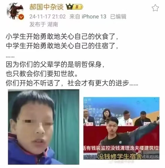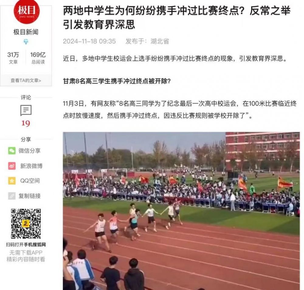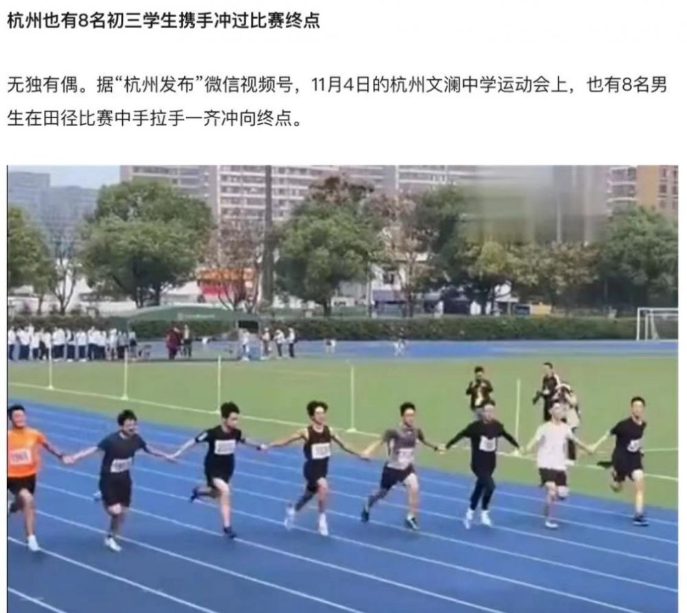 最近看到几条让人心情舒畅的消息,云南某地一中的孩子强行登台发表意见,批评学校没钱修学生宿舍却有钱建草堂;某学校孩子对学校食堂提出批评;某中学生运动会上,素不相识的中学生在百米赛跑中手拉手冲刺,并列第一,这是对内卷和竞争的无声抗议,又像是对全国少年发出暗号:莫辜负少年好时光,让所谓的竞争见鬼去吧!