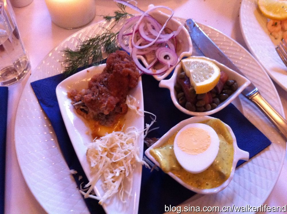 这个就是招牌菜了,一点酸豆,鲱鱼,还有酱料,确实是完全没有经历过的味道,还算可以接受吧。和平常吃的西餐比起来,味道有点浓,有点怪,很难忘记的经历。