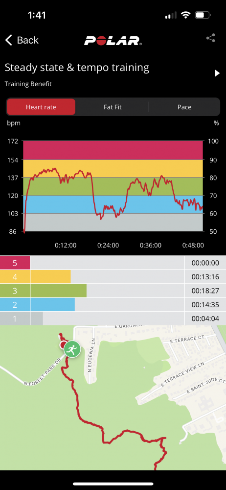在跑步机上做interval training一个多月,到moutain trail跑步感觉比以前快了一些, 以前爬山基本就是走。现在的树叶还是新绿,蚊虫不多,鸟叫明显比冬天多了不少,大口呼吸的都是新鲜的空气,跑完一身大汗,非常爽!感觉在山林里面跑步要很专心,尤其是今天地有些湿,要很认真地判断地况,挺练脑子和平衡的。今天带了Polar测心率,没有什么不舒服的。以后每次都戴。希望这个season结束的时候,能够有一个好成绩。