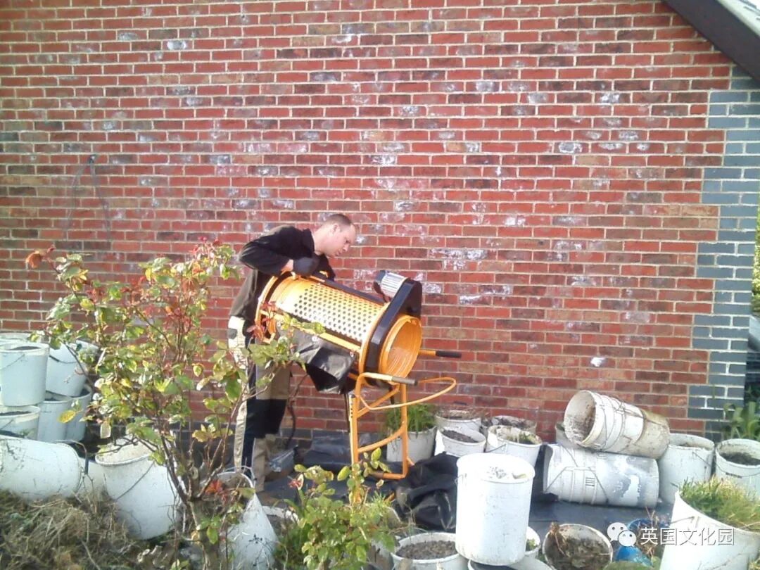 我无语,只好任他挖个够。我估摸他这样挖下去会耽误了播种季节,就到他不挖的地方去翻土准备播种,同时也准备了大大小小各种容器种植。筛了十几大桶的土,丈夫终于感到工作量的巨大,干脆花了近400英镑买来电动筛土机,走“农业自动化”之路。