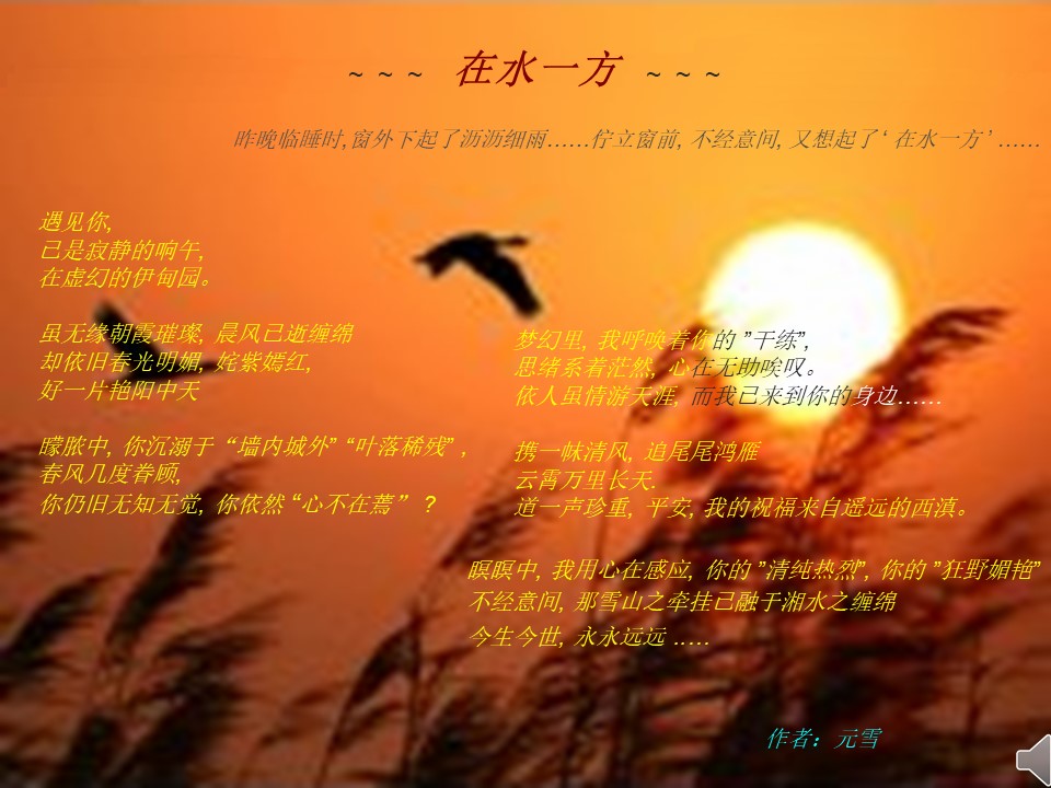 昨晚临睡时, 屋外下起了沥沥细雨。佇立窗前, 不经意间, 又想起了 '在水一方' ……