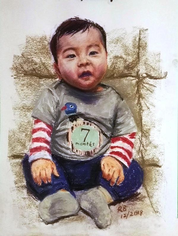 几天没动笔,手痒的很。昨天终于把画架搬进来,着手画三外孙Eren的七月像。色粉主要用从国内买的雄狮牌软彩粉,纸是Canson的无底色色粉纸。这幅画的比较耐心,昨天两小时,今天大约4-5小时。这种48色的彩粉色彩选择还是不足,许多时候只能是选近似色。但效果还是不错。虽然已经关注五官和身体的结构问题,但结构似乎依然是个问题。继续加油吧。请批评!