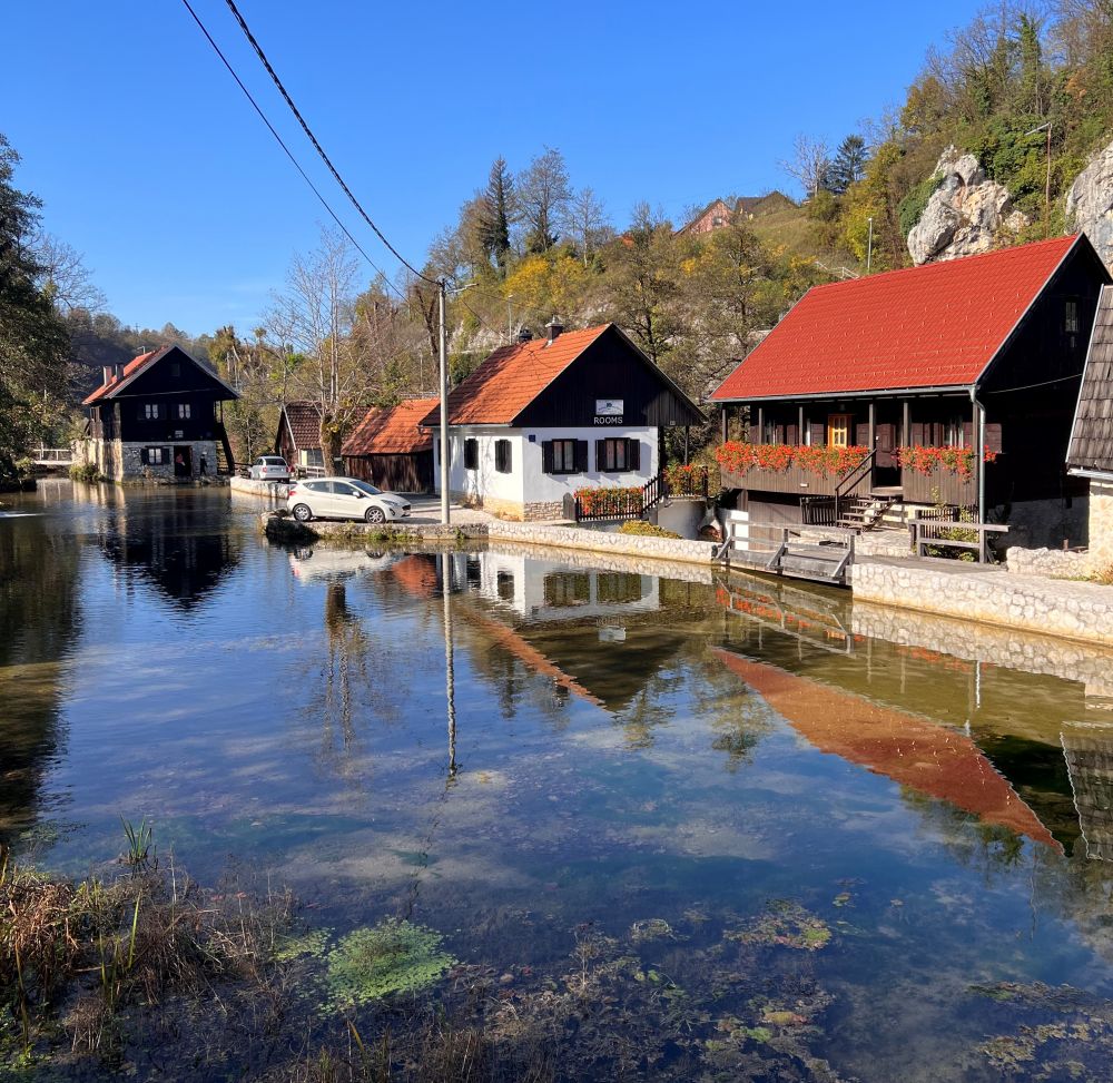 在下面接着就是出名的十六湖Plitvice国家公园。去往Plitvice湖途中,因为时间有多停了一个小镇Rastoke(图13-15)。如果在十六湖时间有多可以去看看,离开大约30分钟。当时订十六湖住宿的时候特意定在离公园2号门20分钟步行的地方,打算早上步行去公园省了Parking的麻烦。到了以后发现那一带路边没有sidewalks,步行不是很容易,最后还是开车去了。停车8kuna(1美金多一点)一小时。民宿的女主人特别耐心地介绍了游玩十六湖的计划,让我们走了H路程,这样避开人群,乘ferry排队时间少,而且步行基本一路下坡,真的帮了大忙。十六湖门票有季节性差异,10月份的180kuna差几天到了11月就只要80kuna了,夏天的好像300多。虽然去的时候10月底了,到了中午游客还是很多,一个ferry排队好像有几百米长,幸好这是和我们H行程相反的方向。再有就是10月底欧洲夏令时结束,有的酒店7点半以后才有早饭,这样到天黑就只有8小时代day light了,这也是利用旅游shoulder季节的不足之处吧。这次十六湖时间上误判了,公园里秋色比较浓,树林花木也有点枯萎了,照片不如其他同学夏天拍的那么艳丽了吧?如果想看十六湖最佳色彩应该在夏天去的。不过10月下其它各地游客都不多,据当地人说不少地方餐馆酒店到11月会关门过冬。
