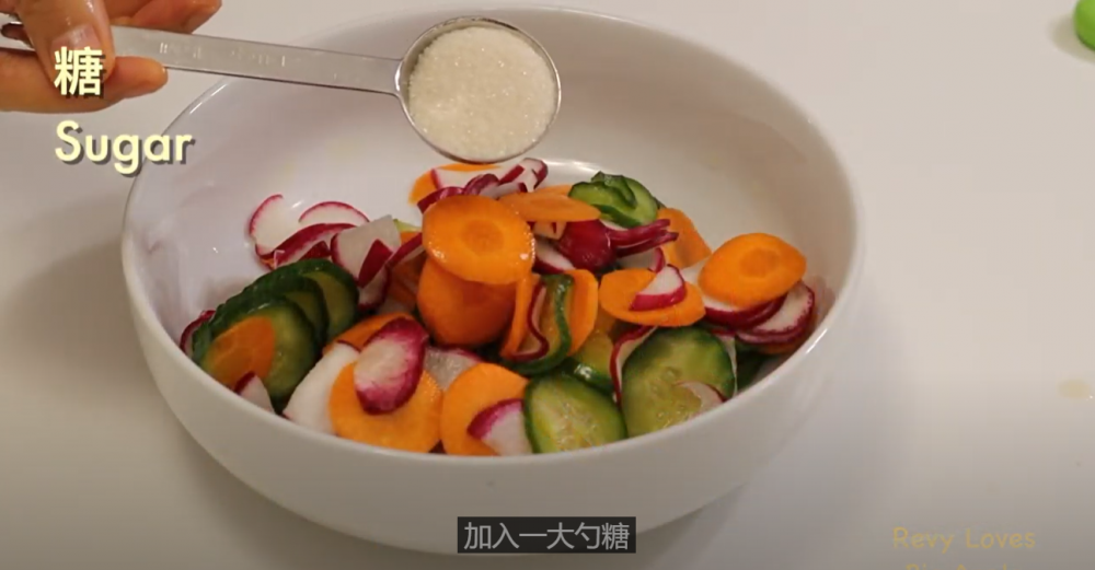 3)半小时后,蔬菜已经出了很多水了,把水挤干后,加入调料。盐:1/3 小勺, 糖:1大勺, 醋:1.5大勺。糖和醋的比例可以跟据自己的喜好调整