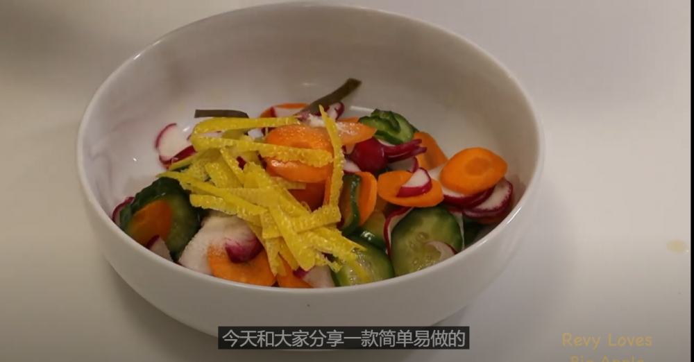 材料: 胡萝卜:1根 黄瓜:1根 樱桃萝卜:4个 昆布:1片 柠檬:1个,只取表皮 盐:1/3 小勺+1/3 小勺 糖:1大勺 醋:1.5大勺