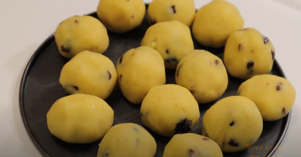 之后放入冰箱冷藏一个小时,然后拌入蔓越莓,搓成50g一个的小球