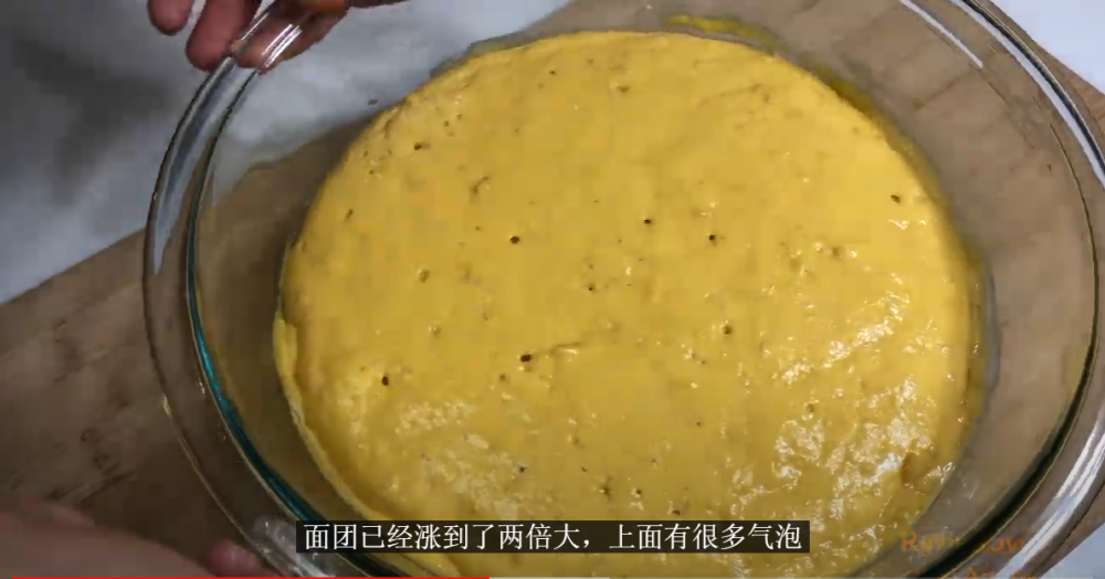 这是发酵好得样子,很多气泡。然后要搅拌排气,倒到模具中二次发酵10分钟
