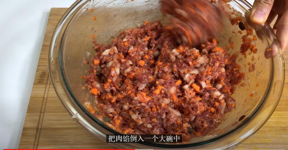 2) 馅料: 牛碎肉:300g 洋葱:半个 胡萝卜:一个 鸡蛋:一个 糖:0.5大勺 酱油:2大勺 香油:1大勺 黄豆酱:1大勺 黑胡椒粉:适量 水:60ml
