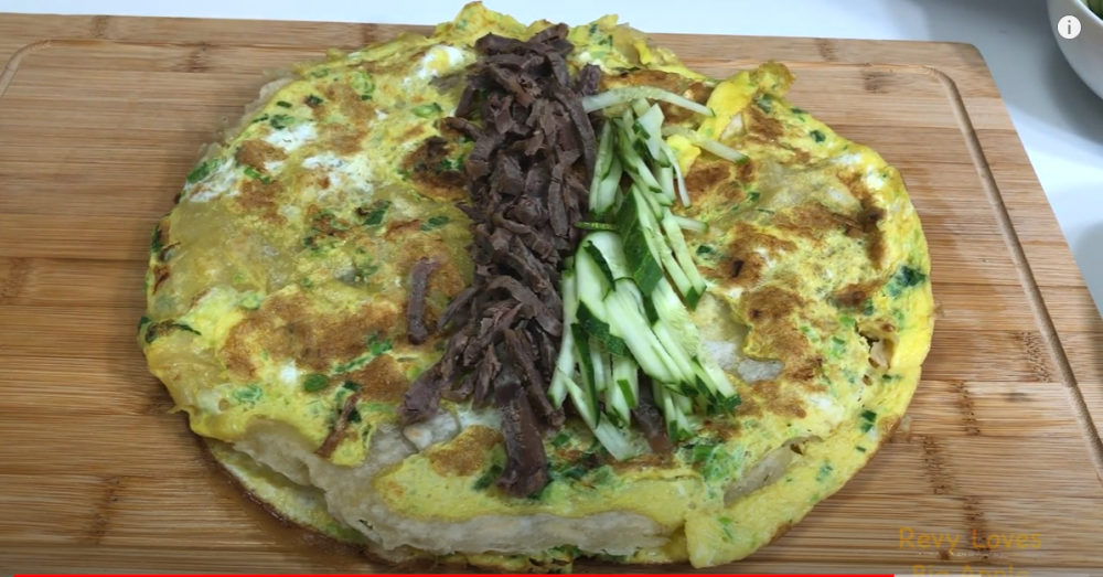 3)翻面后倒入蛋液,待蛋液凝固后再翻面烙一会就可以出锅