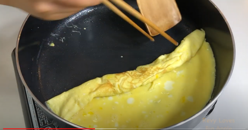 2)第一层蛋液倒入后,蛋液半凝固开始卷。