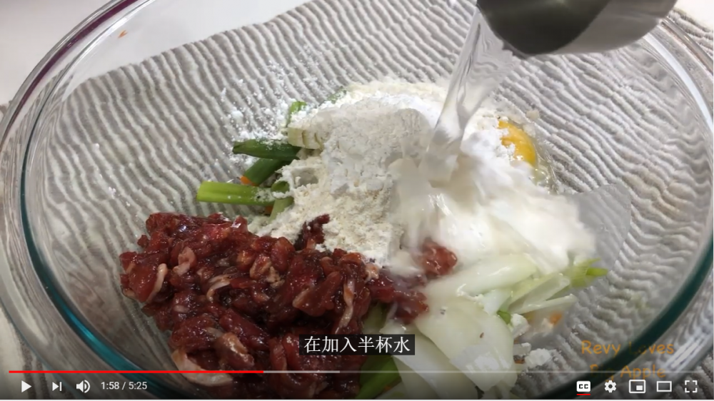 材料: 牛肉:100g, 洋葱:半个, 小葱:三根, 胡萝卜:一小段, 鸡蛋:一个 面粉:1/2杯, 淀粉:1/4杯, 水:1/2杯