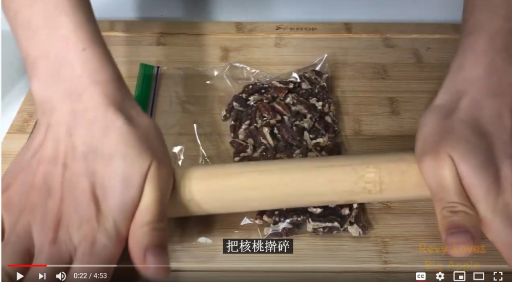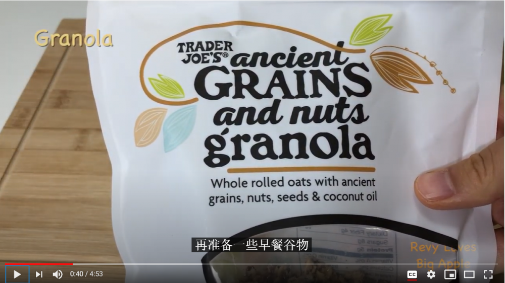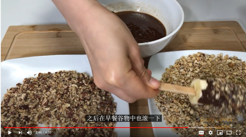 香蕉在巧克力酱中滚一圈,沾满巧克力酱,再在核桃碎和谷物碎中滚一遍,裹满核桃碎和早餐谷物