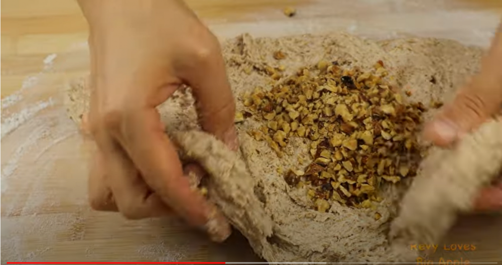 材料: 中筋面粉:250g 全麦面粉:250g 酵母:5g 糖:5g 温水:280g 核桃: 65g