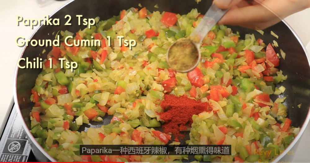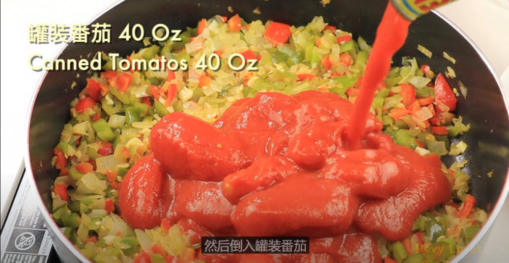 2)所有材料都炒软之后,放入调料和罐装番茄。这道菜用罐装番茄效果会比较好,如果用新鲜番茄,最好搭配些番茄膏,才能达到理想效果。