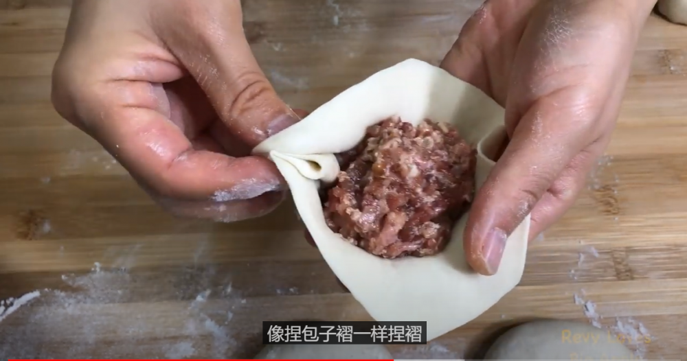 4)擀皮擀成中间厚边缘薄的饼皮,然后像包包子一样包起来按扁就可以了