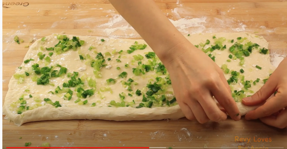3)然后擀成一个长方形的面饼,涂上一层油,撒上葱花,干面粉,盐。然后卷起来,分成10等份