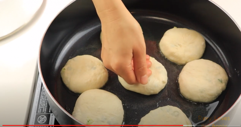 5)放入锅中的时候,稍微按扁一下(否则一会鼓起了,就成煎馒头了哈),然后表面刷点油锁逐水份,盖上盖子煎2分钟