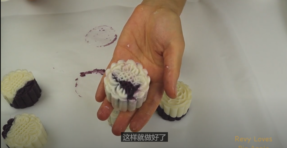 3)都揉好后就可以压模了,取一个紫薯球和一个山药球放入模具种,变换紫薯球和山药球的位置,就可以呈现不同的外观。