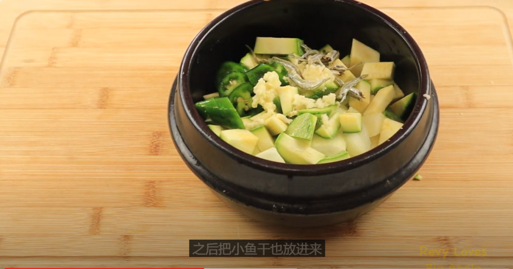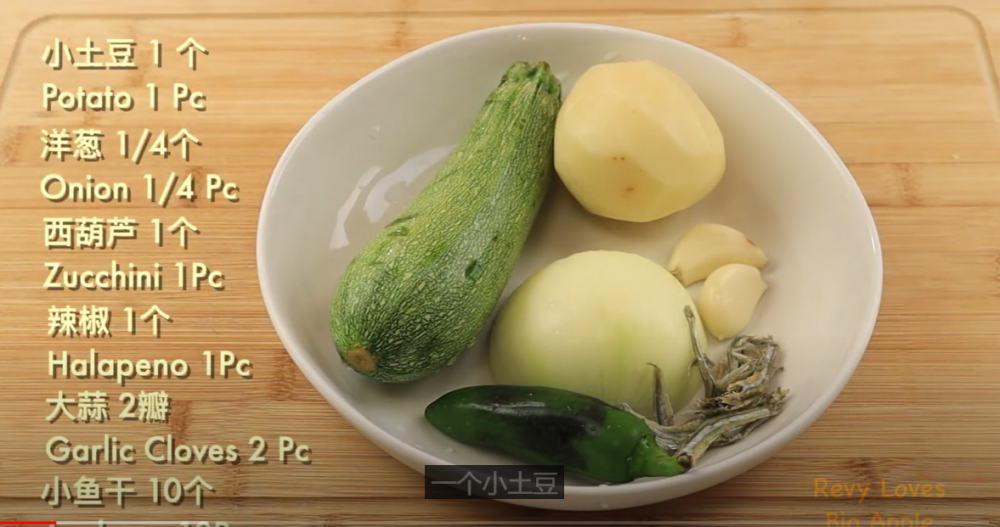 小土豆: 1 个 ; 洋葱: 1/4 个; 小西葫芦: 1 个; 墨西哥辣椒:1个; 大蒜: 2瓣 ;小鱼干 : 10个; 豆腐:半块 (8 Oz); 小葱:1根; 小红椒:1个; 韩式黄豆酱:2 大勺; 韩式辣酱:1大勺
