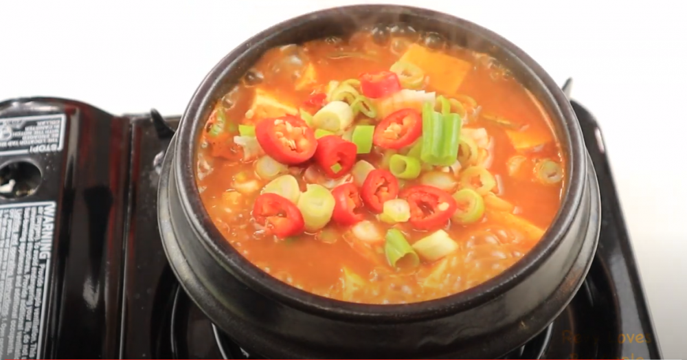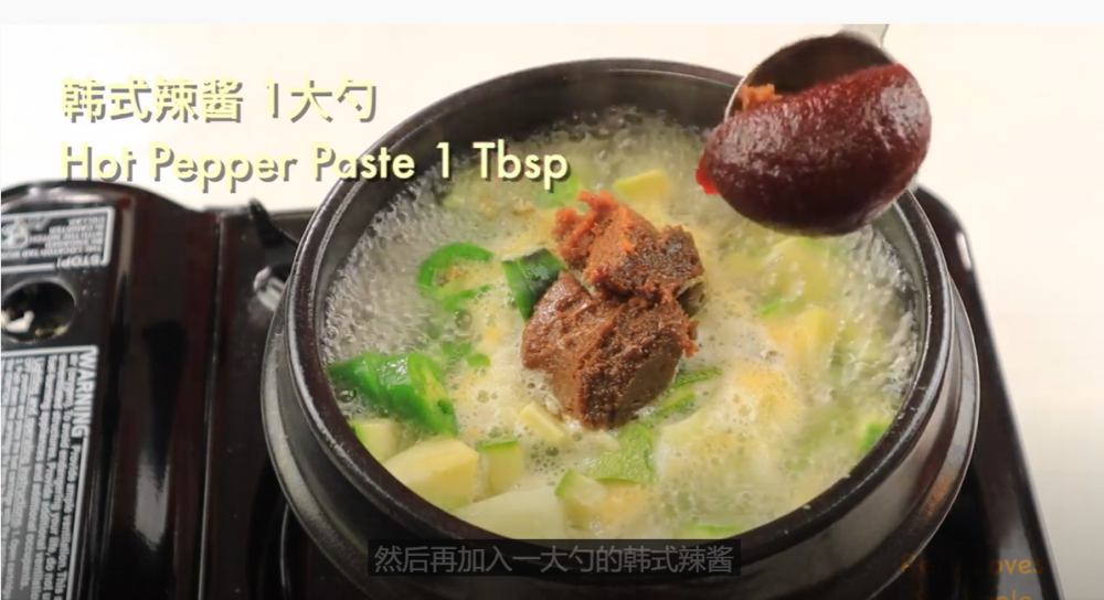 3)然后在石锅里加一杯水,大火烧开后加入两大勺韩式黄豆酱,一大勺韩式辣酱,之后转小火煮20分钟