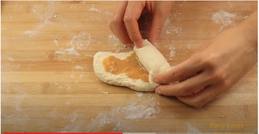 4)每一个小剂子直接按扁拉长,然后涂上花生酱,卷起来收口即可。 因为面团含水量大,所以非常容易收口,视频里展示了两种方法,可以怎么方便怎么收,不漏馅儿就可以。