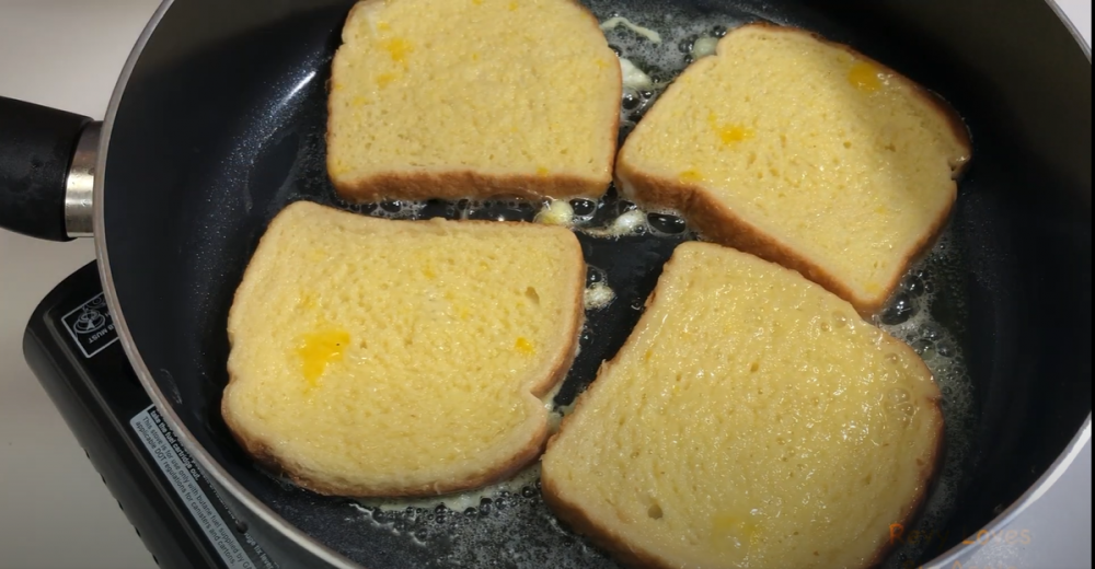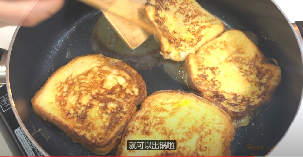 3)面包每面再蛋液里面浸5秒钟就可以了(时间长了会太湿),然后放入锅中煎。我这些材料,刚好煎4片面包。