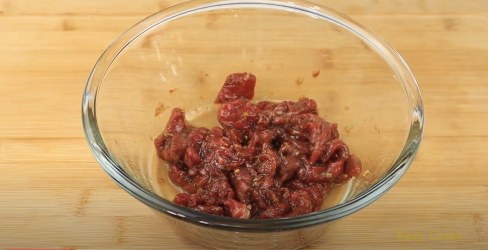 牛肉片: 4OZ or 110g, 酱油:2 Tsp, 糖: 1 Tsp ,香油: 1 Tsp, 蒜瓣: 1 Pc, 黑胡椒: 适量,