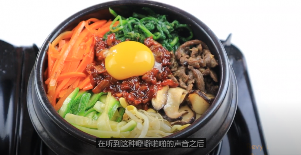 步骤五:拌饭。石锅底部涂香油,放上米饭,然后摆入菜,中间放两勺辣酱,上面放一个蛋黄,开火,听到滋滋响声就后再小火煮5分钟就可以吃啦。