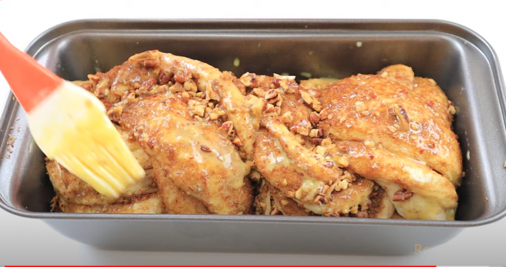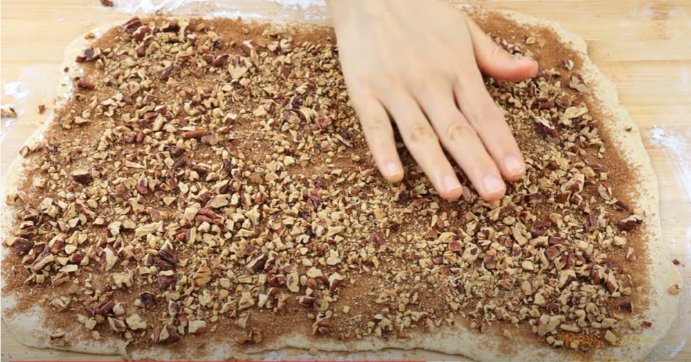 3)把发好的面团拿出来直接倒在案板上,折叠几下后,擀成长方形,上面先刷上一层融化的黄油,然后撒上红糖肉桂粉,最后铺上切碎的山核桃