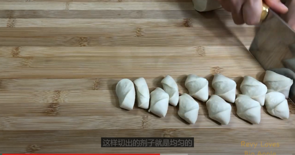 3)面醒好后,揉成长条,然后切剂子,切的时候一边切一边转,这样切出的剂子就是均匀的,不会越来越扁