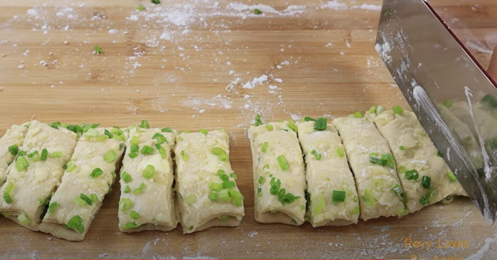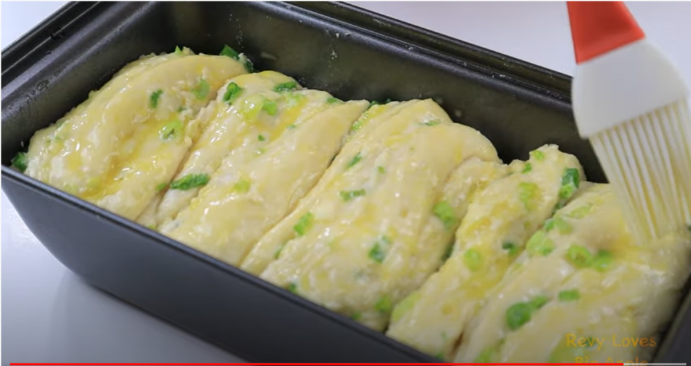 3)把面团擀成长方形,然后涂上蒜泥黄油馅,再撒上些葱花,切成三条,叠起来,再切成两指宽的小条,然后竖着放入吐司盒