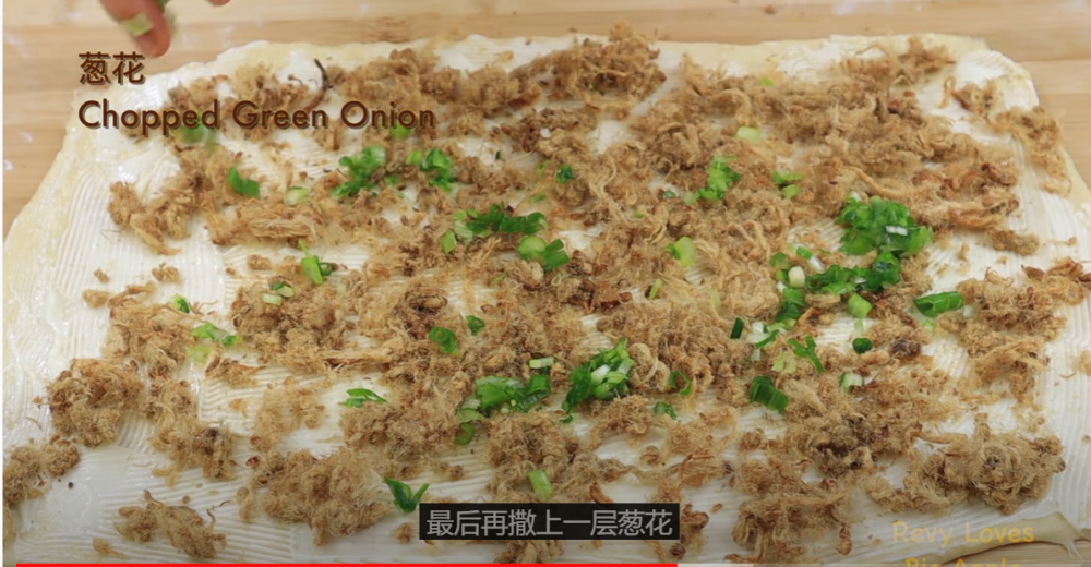 2)发好的面团折叠几下,然后擀成长方形的大面饼,刷上一层蛋黄酱,撒上肉松和葱花。馅料的量丰俭由人。