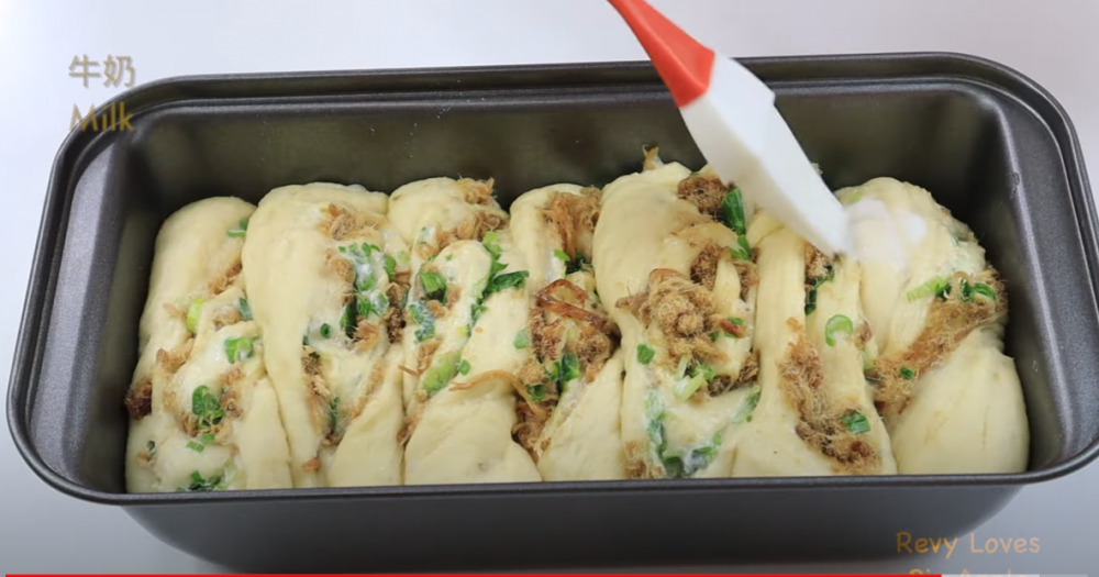 4)做好后放入吐司盒,二次发酵到两倍大,发酵好后刷上牛奶,放入烤箱,350华氏度,175摄氏度,烤30分钟左右