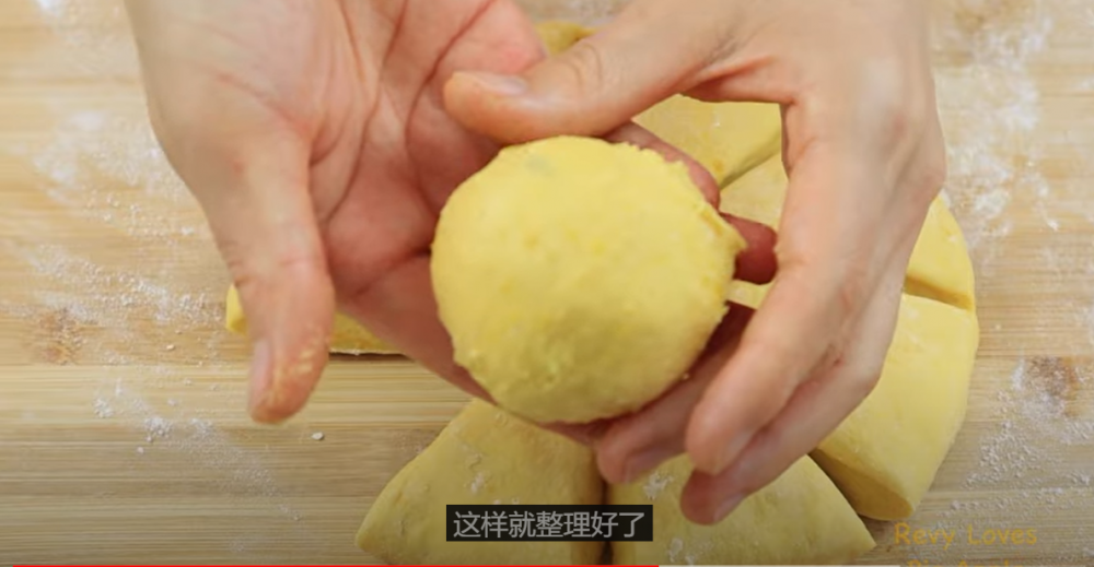 3)每一份面团,继续从四周向中间折叠,整理成一个圆形的面包坯