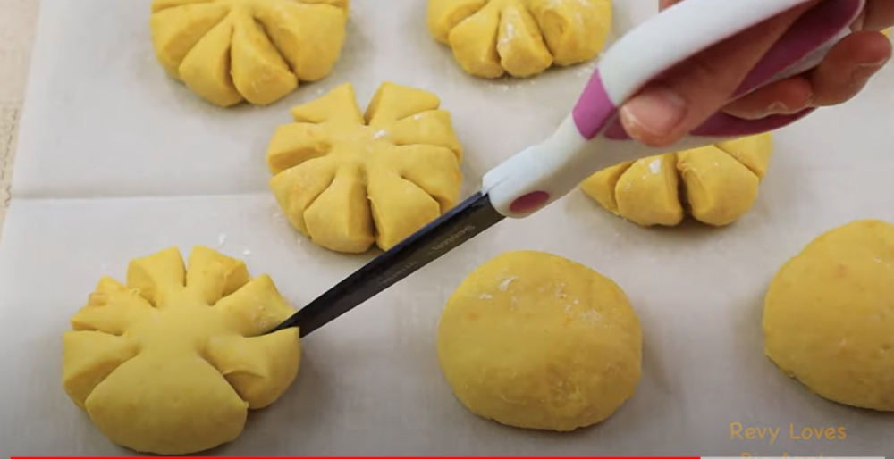 4)都整理好后,放在烤盘上,面包坯之间要留有足够的缝隙,然后轻轻压扁,用剪刀剪8刀,这样南瓜的纹路就出来了。之后盖上保鲜膜,二次发酵到两倍大。