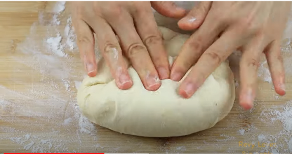 2)发酵好的面团直接倒在案板上,从四周向中间折叠几下,这个折叠的过程也是个整理的过程,最后整理成一个长方形的面饼。