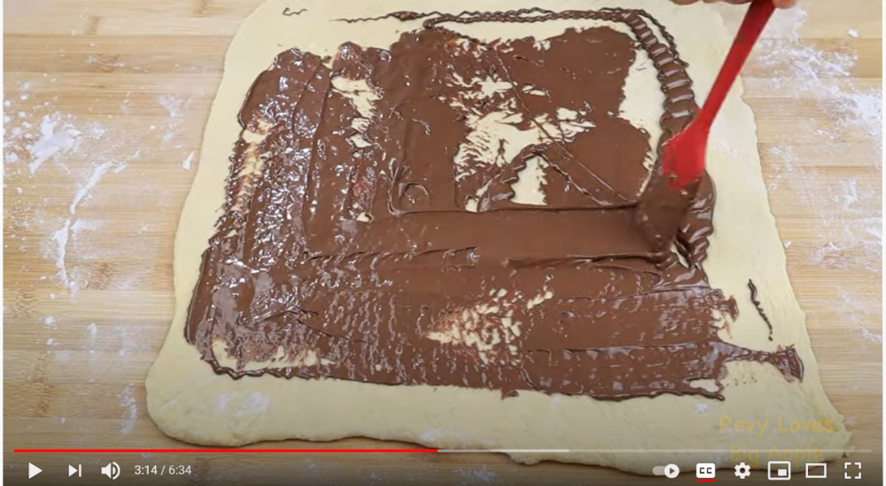 3)用擀面杖擀开,最后的厚度可以跟据个人的喜好调整。之后涂上杏仁巧克力酱,如果这个酱比较浓稠的话,用微波炉加热10~15秒就比较容易涂开了