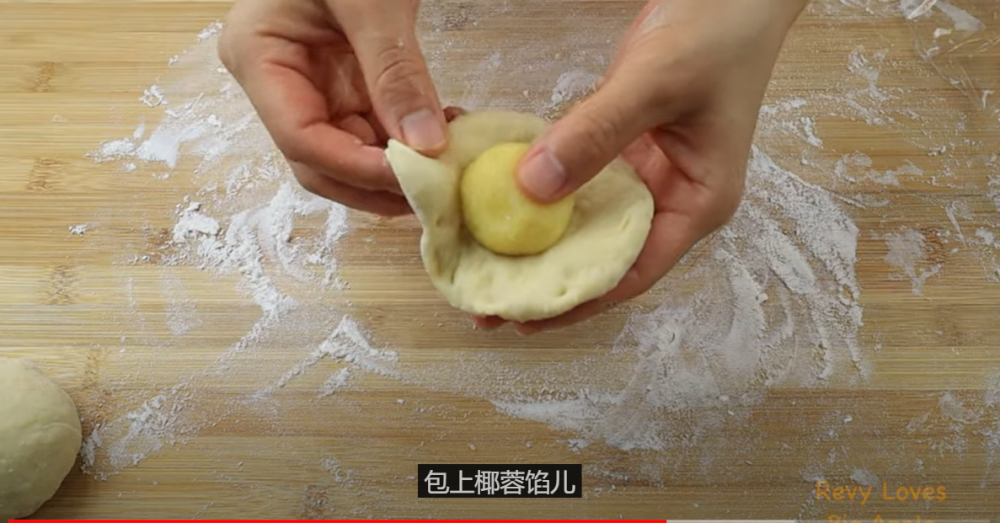 3)面团发好后,直接倒在案板上,折叠几下,整理成一个圆形的面饼,然后切成8等份,每一份从四周向中间折叠,整理成一个圆形的面包坯,然后把面包坯压扁,包入椰蓉馅