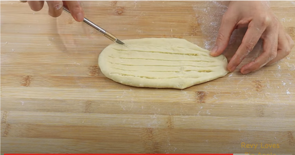 4)包好后擀成巴掌大小的椭圆形。平行划几刀。