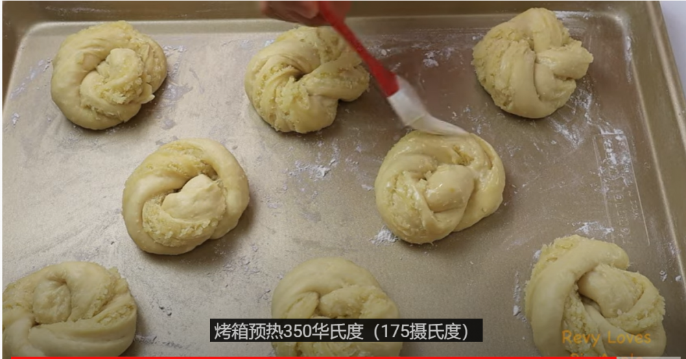 6)都做好后放到烤盘上,盖上保鲜膜,二次发酵到两倍大,发酵好后,刷上蛋液,放入烤箱,350F (175C)烤20分钟左右。
